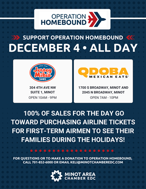 For more information on how you or your business can support Operation Homebound, please contact the Minot Area Chamber EDC at 701-852-6000 or email keli@minotchamberedc.com